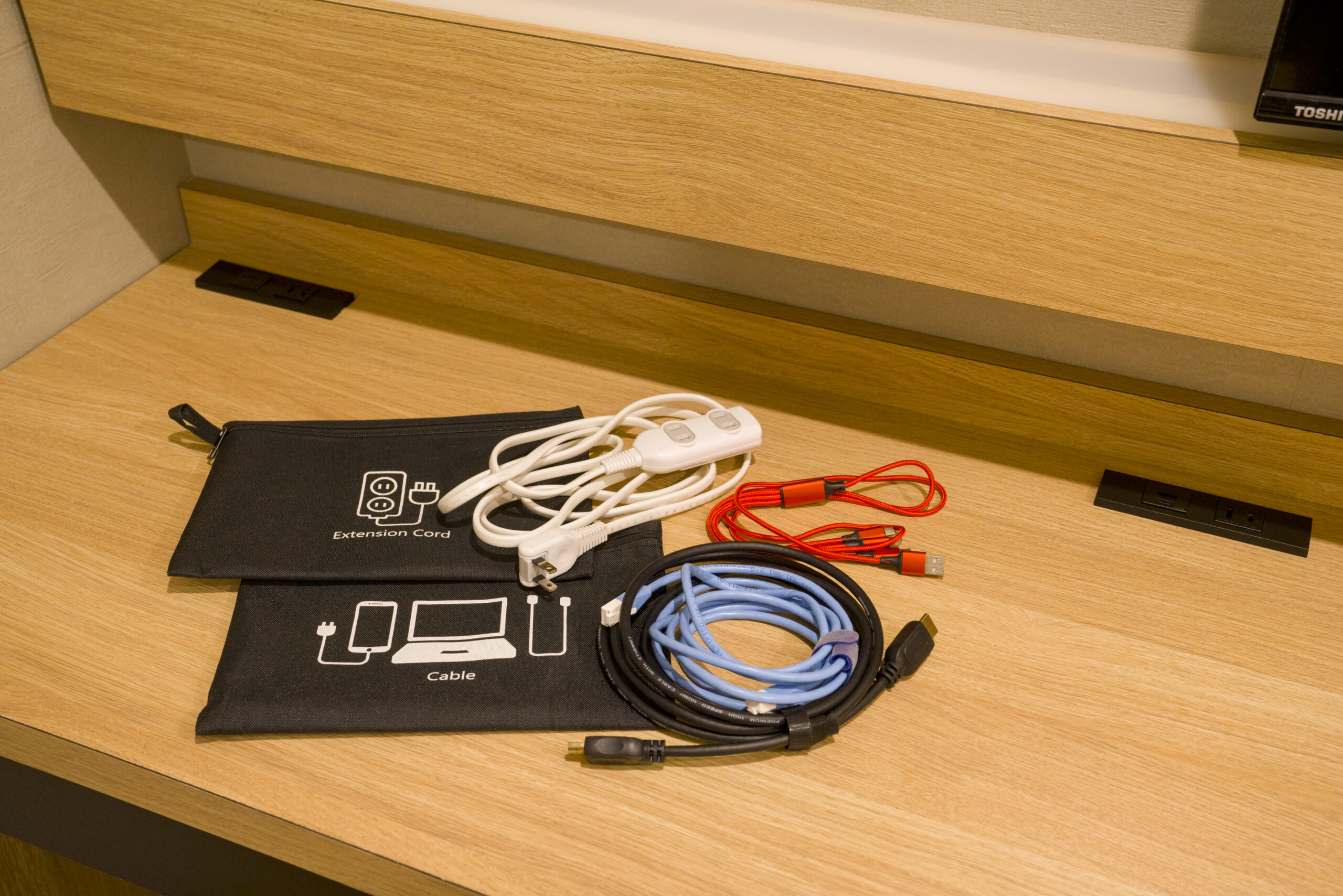 LANケーブルとHDMIケーブルの他、マルチ充電ケーブル(Lightning/USB microB/USB Type-C)、延長コードも客室備え付けです。