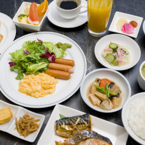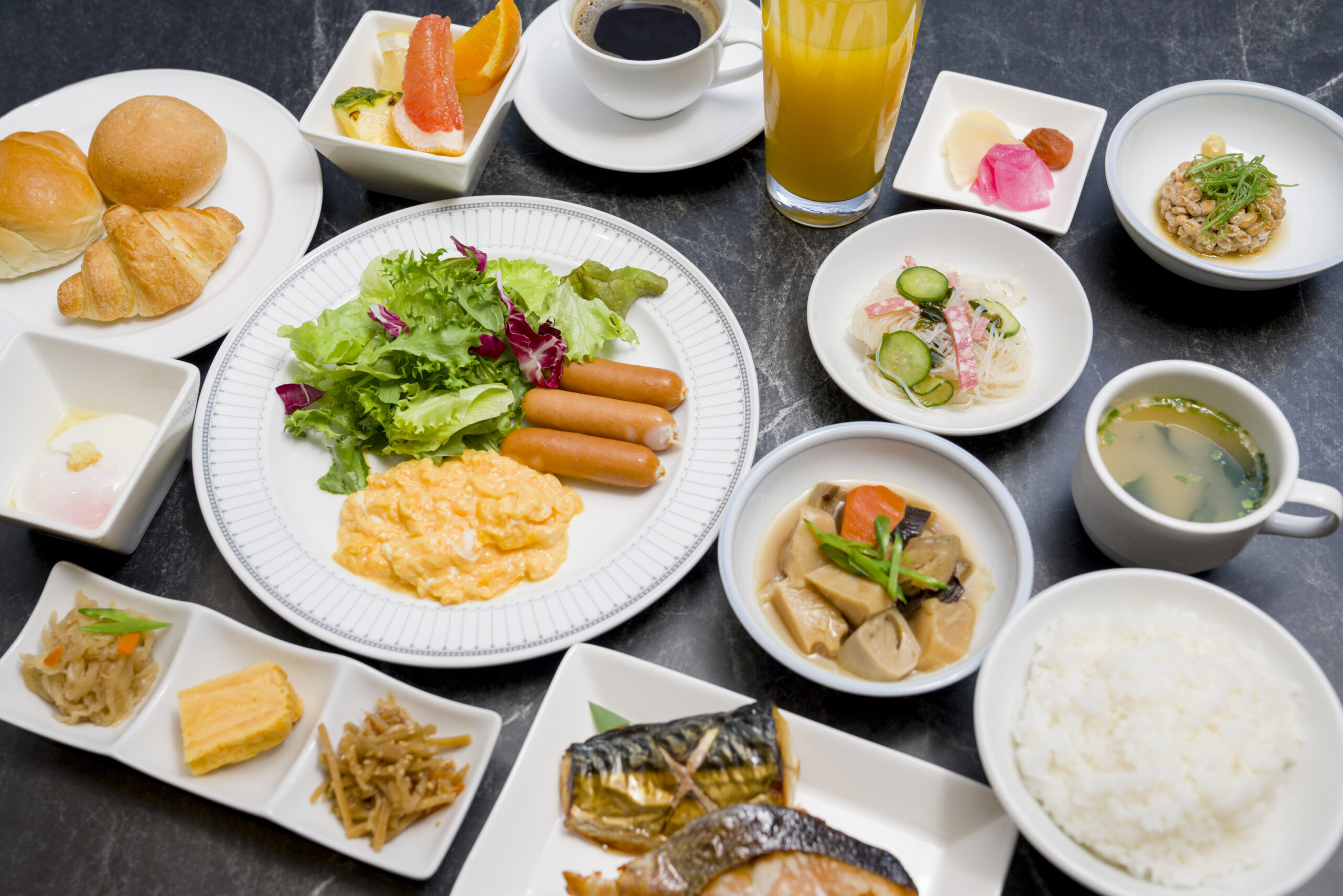 茨城産コシヒカリや地場野菜、奥久慈卵など茨城産のこだわり食材を使用した朝食